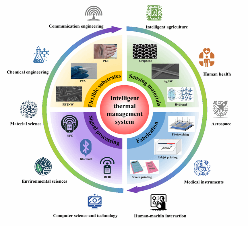 在技术融合的时代,材料科学与电子信息技术的交叉催生了柔性智能热管理系统(Flexible Intelligent Thermal Management Systems, FITMS)。柔性智能热管理系统是一种先进的解决方案,旨在以灵活和智能的方式检测和调节人体、设备和环境的温度。当传统的刚性传感器由于空间限制、非标准形状或便携性需求而无法满足需求时,这些系统变得尤为重要。该系统最初使用柔性温度传感器实时监测温度;然后它收集温度数据并将其转换为电信号;这些信号通过有线或无线通信技术传输到中央服务器或控制单元;服务器接收并分析信号后,以可视化的形式向用户提供反馈。该智能系统可确保实时准确的温度监测,与用户进行有效的沟通和互动,以及高度自适应和用户友好的热管理解决方案。虽然目前已有综述聚焦功能材料、传感器设计及系统集成,但多数缺乏对实际应用场景的深度剖析。因此,仍然需要对柔性智能热管理系统的先进材料、系统集成和实际应用进行全面的综述。